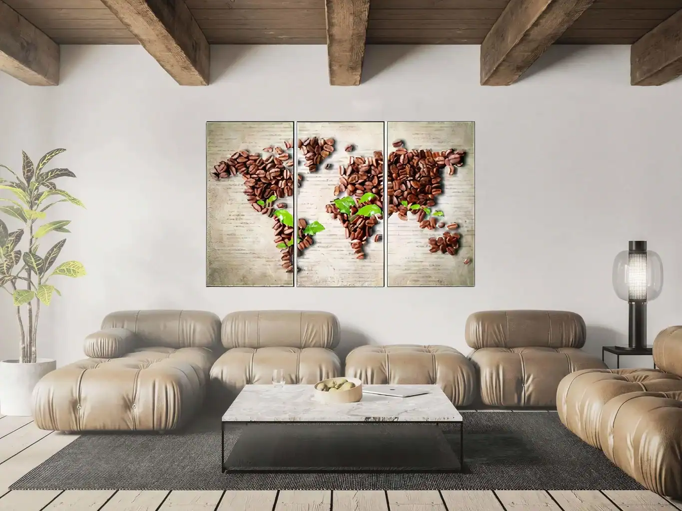 Le salon est souvent la pièce centrale de la maison et mérite donc une décoration soignée. Un grand tableau carte du monde peut être installé au-dessus du canapé pour attirer l'attention et devenir le point focal de la pièce.